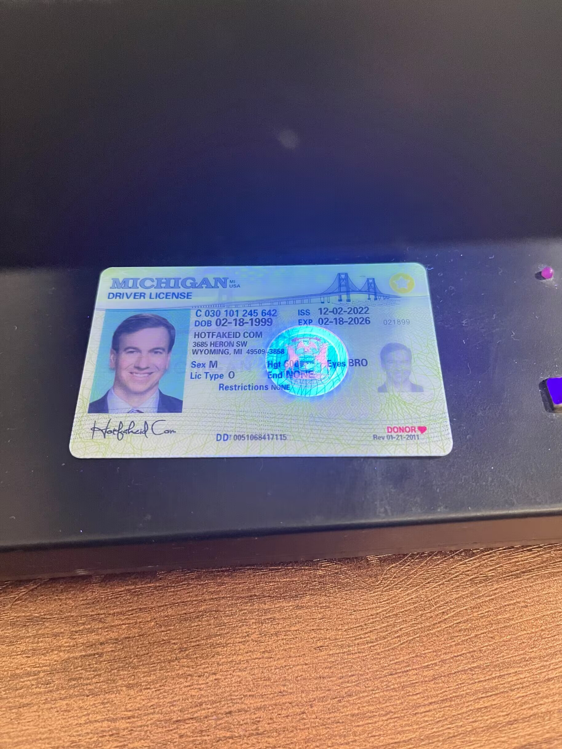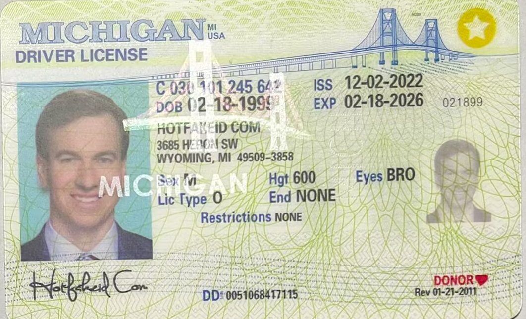 Scannable Michigan identification comes with advanced holograms and optimized using engraving technology. This product is known for passing in local bars & dispensaries.